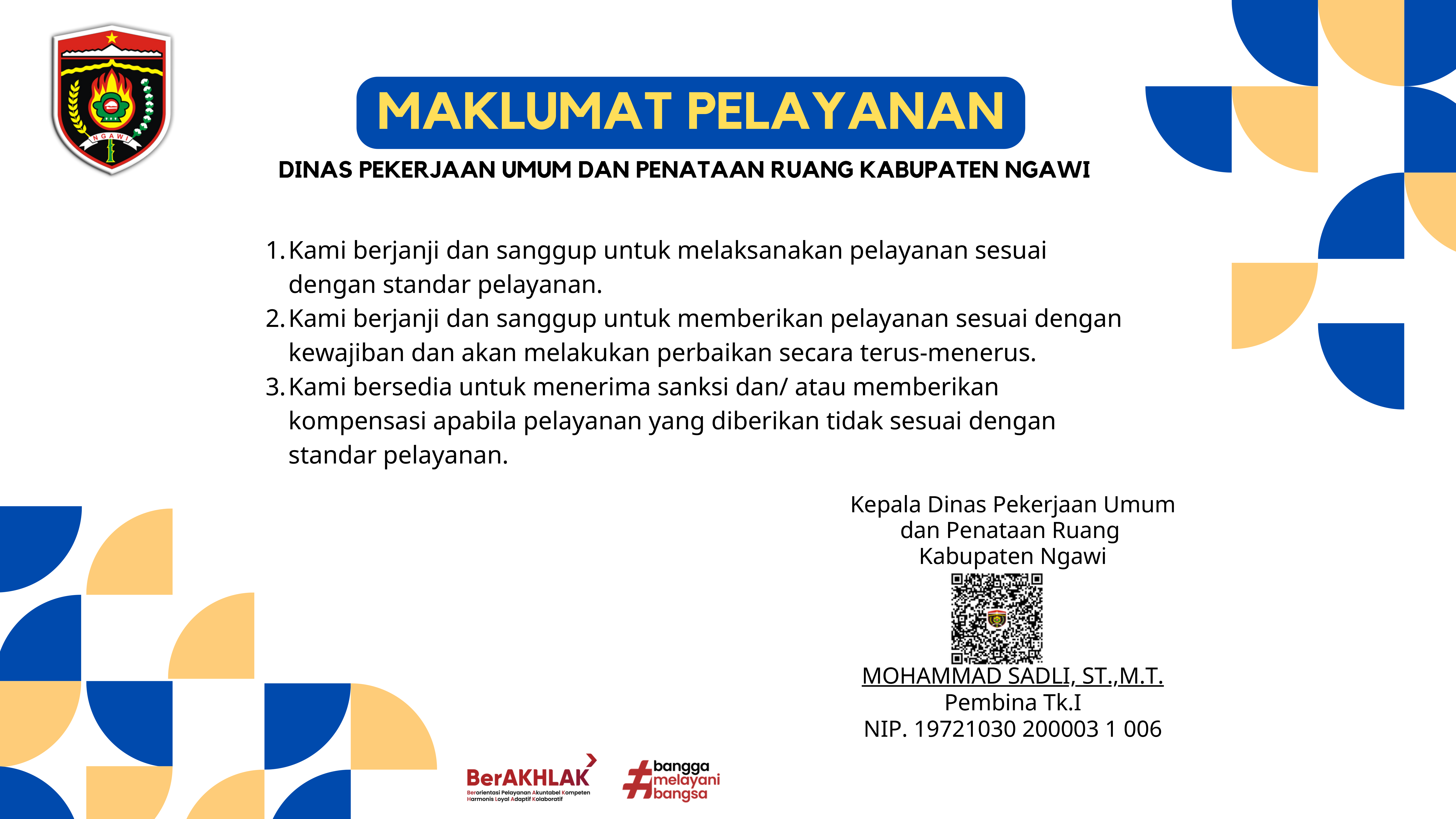 Sebagai bentuk komitmen terhadap peningkatan kualitas pelayanan publik, Dinas Pekerjaan Umum dan Penataan Ruang (PUPR) Kabupaten Ngawi menyatakan maklumat pelayanan yang menjadi pedoman bagi seluruh aparatur dalam memberikan layanan kepada masyarakat.