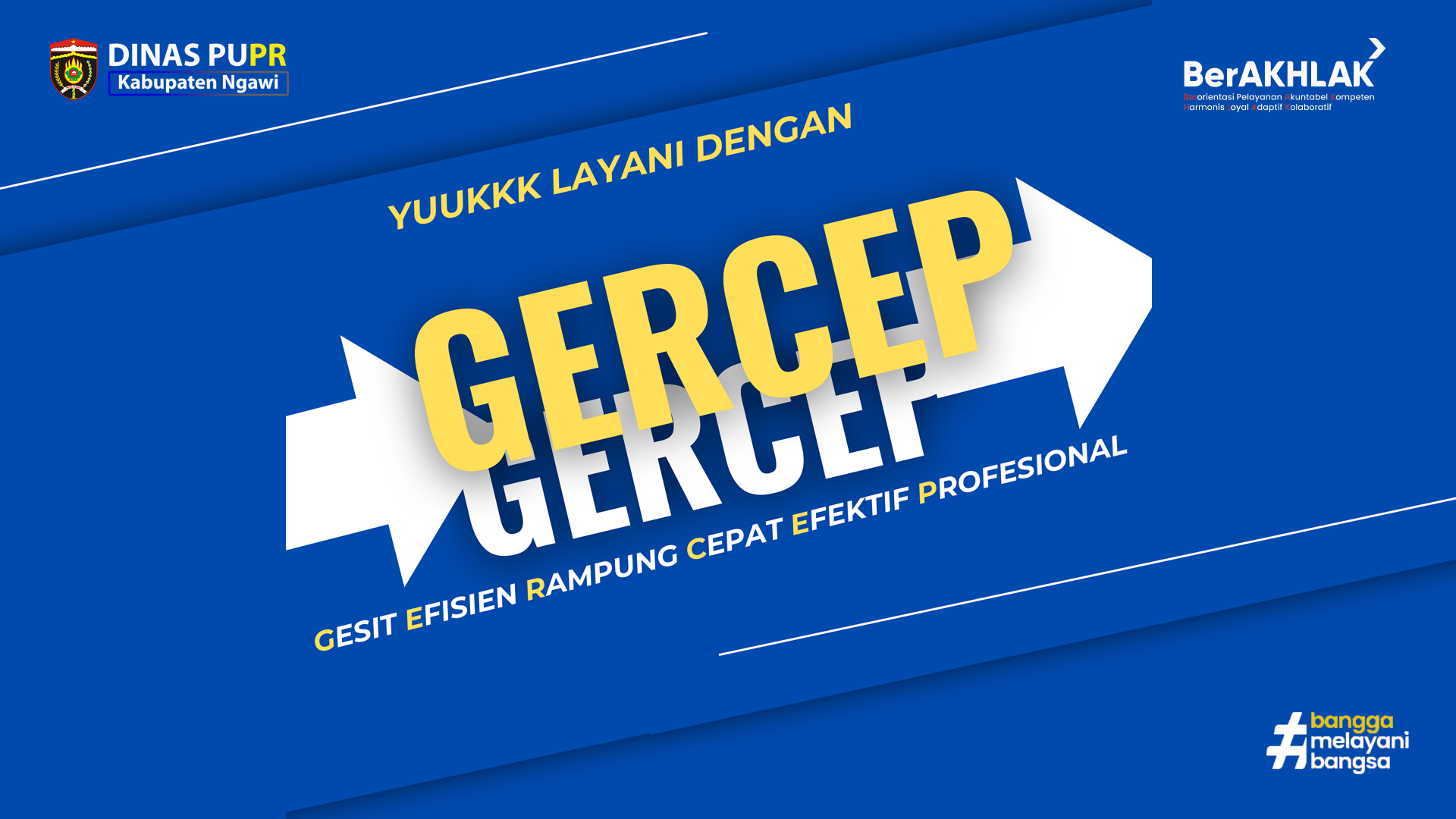 Dalam upaya mewujudkan pelayanan publik yang prima, Dinas Pekerjaan Umum dan Penataan Ruang (PUPR) Kabupaten Ngawi memiliki motto pelayanan “GERCEP”, yang merupakan akronim dari Gesit, Efisien, Rampung, Cepat, Efektif, dan Profesional.